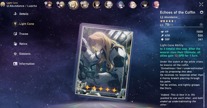 Choose a Light Cone Abundance that complements Luocha’s abilities. Echoes of the Coffin remains the top choice. At the same time, 4-star options like Post-Op Conversation, Shared Feeling, and Perfect Timing can also be considered. Quid Pro Quo, available at the Forgotten Hall Shop, is another excellent choice.
