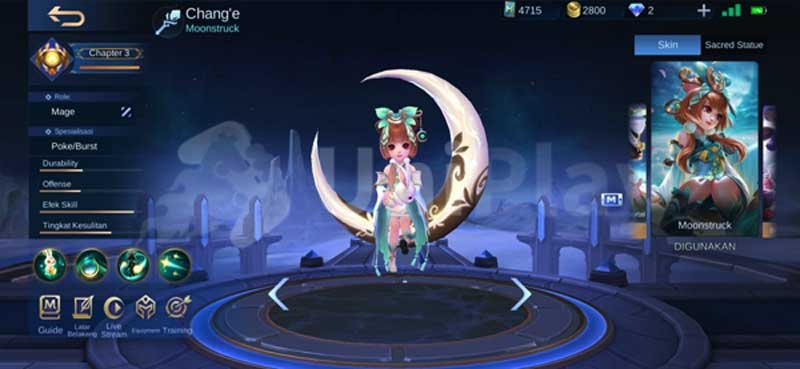 Chang’e MLBB memanggil kekuatan bintang yang terus menerus menyerang musuh dari jarak jauh. Itu memberikan damage besar dan berkelanjutan. Serangan ini sulit dihindari dan dapat menguras HP musuh secara perlahan.