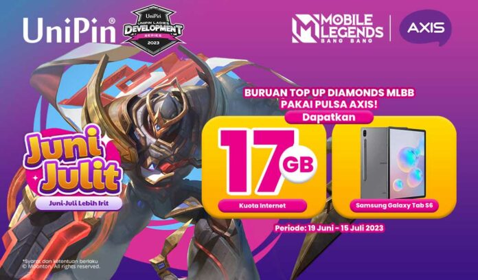 Udah siap nonton pertandingan epic para player tangguh MLBB di ULDS? Biar makin seru, AXIS dan UniPin bagi-bagi 17GB kuota internet dan Samsung Galaxy Tab S6 nih. Top up Diamonds MLBB kamu di UniPin dengan pulsa AXIS sebanyak-banyaknya buat dapetin hadiahnya! Penasaran kan? Cek syarat dan ketentuan lengkapnya berikut ini ya!